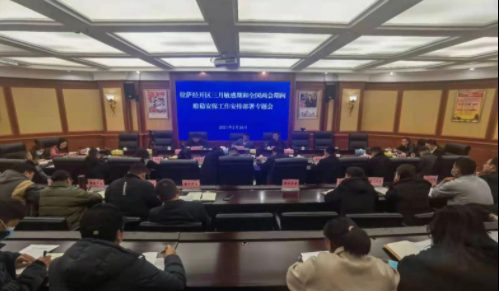 根据区市党委、政府关于2021年三月敏感期和全国两会期间安保维稳工作要求,2月26日上午,拉萨经开区召开2021年三月敏感期和全国两会期间维稳安保工作安排部署专题会,会议由经开区党工委委员、党政办主任黄辅龙主持,经开区党工委委员、管委会副主任达瓦次仁出席会议并讲话,经开区党工委委员、管委会副主任次仁达吉出席会议,管委会各局(室)、直属国企、德吉康萨社区党委、堆龙德庆区消防救援大队负责人和十五个责任片区责任人参加会议。