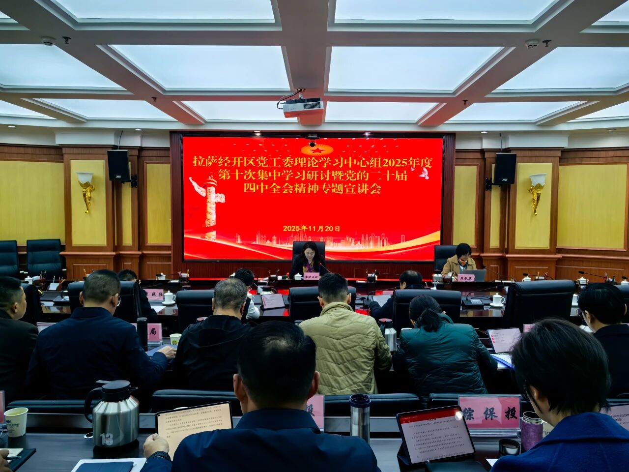 近日,拉萨市副市长、经开区党工委书记白玛玉珍主持召开拉萨经开区党工委理论学习中心组2025年度第十次集中学习研讨会,专题学习研讨党的二十届四中全会精神。市委党校教授廖承英作专题辅导。各局室全体县处级干部,公安分局、税务局、市场监管局、直属国企、加玛街道主要负责人、自治区基层宣讲员参会。党工委在家班子成员作交流发言。